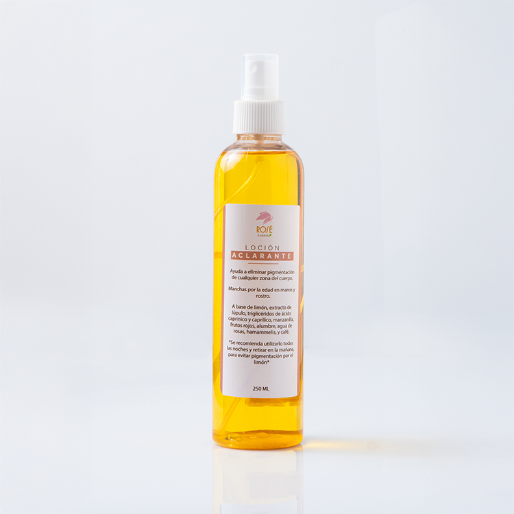 Ayuda a eliminar pigmentación de cualquier zona del cuerpo. Manchas por la edad en manos y rostro. A base de limón, extracto de lúpulo, triglicéridos de ácido caprílico y caprílico, manzanilla, frutos rojos, alumbre, agua de rosas, hamamelis, y café.